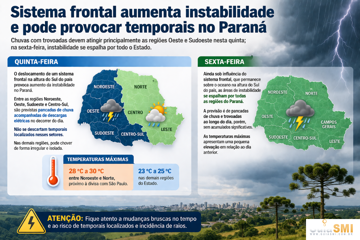 O deslocamento de um sistema frontal na altura da região Sul do país deve provocar aumento significativo da instabilidade atmosférica no Paraná nesta quinta-feira. A previsão indica maior atenção para as regiões Noroeste, Oeste, Sudoeste e Centro-Sul, onde são esperadas pancadas de chuva ao longo do dia, acompanhadas de descargas elétricas.