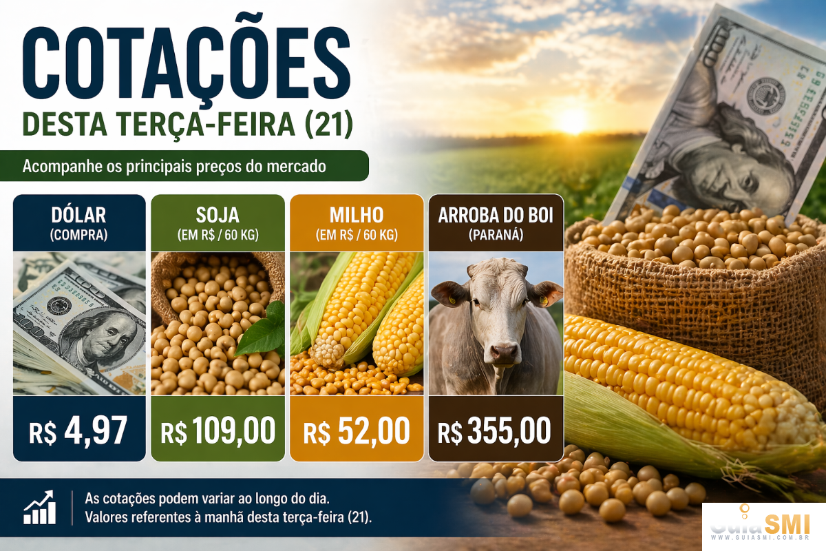 A terça-feira (21) começou com o mercado financeiro e agrícola apresentando cotações estáveis. Na manhã de hoje, o dólar comercial segue sendo negociado em R$ 4,97 para compra, mantendo atenção de produtores e investidores diante das oscilações econômicas.