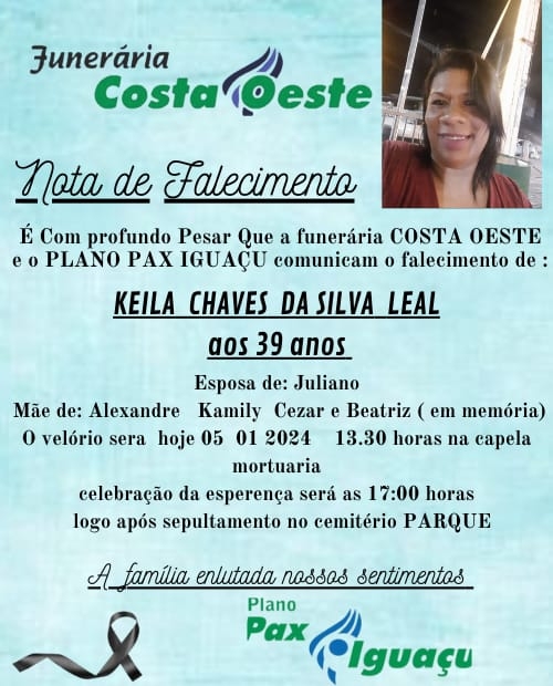 É com profundo pesar que a Funerária Costa Oeste e o Plano Pax Iguaçu comunicam o falecimento de KEILA CHAVEZ DA SILVA LEAL aos 39 anos de idade.