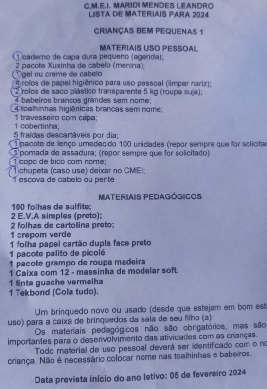 Ao entrar em contato com a redação do Guia São Miguel, a família compartilhou a lista de materiais que inclui caderno, copo, xupeta, lenços, e outros itens essenciais.