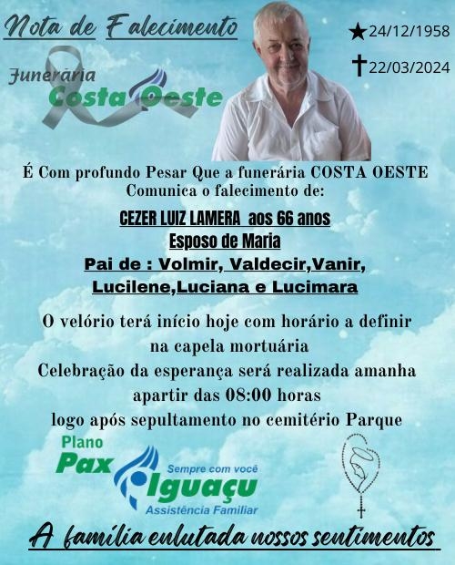 É com profundo pesar que a Funerária Costa Oeste comunica o falecimento de CEZER LUIZ LAMERA aos 66 anos de idade.