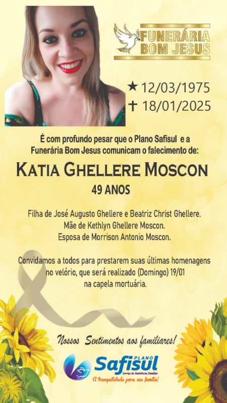 O Plano Safisul e a Funerária Bom Jesus informam, com profundo pesar, o falecimento de Katia Ghellere Moscon, ocorrido hoje, 18 de janeiro de 2025, aos 49 anos de idade.