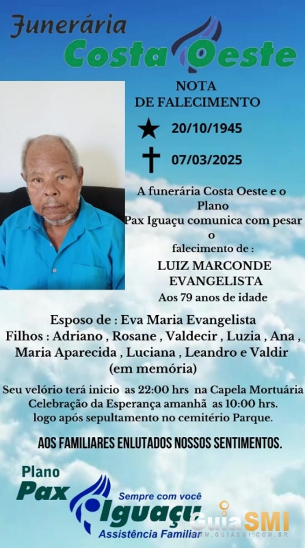 É com profundo pesar que a Funerária Costa Oeste e o Plano Pax Iguaçu anunciam o falecimento de Luiz Marconde Evangelista, aos 79 anos, ocorrido nesta quinta-feira, 7 de março de 2025.