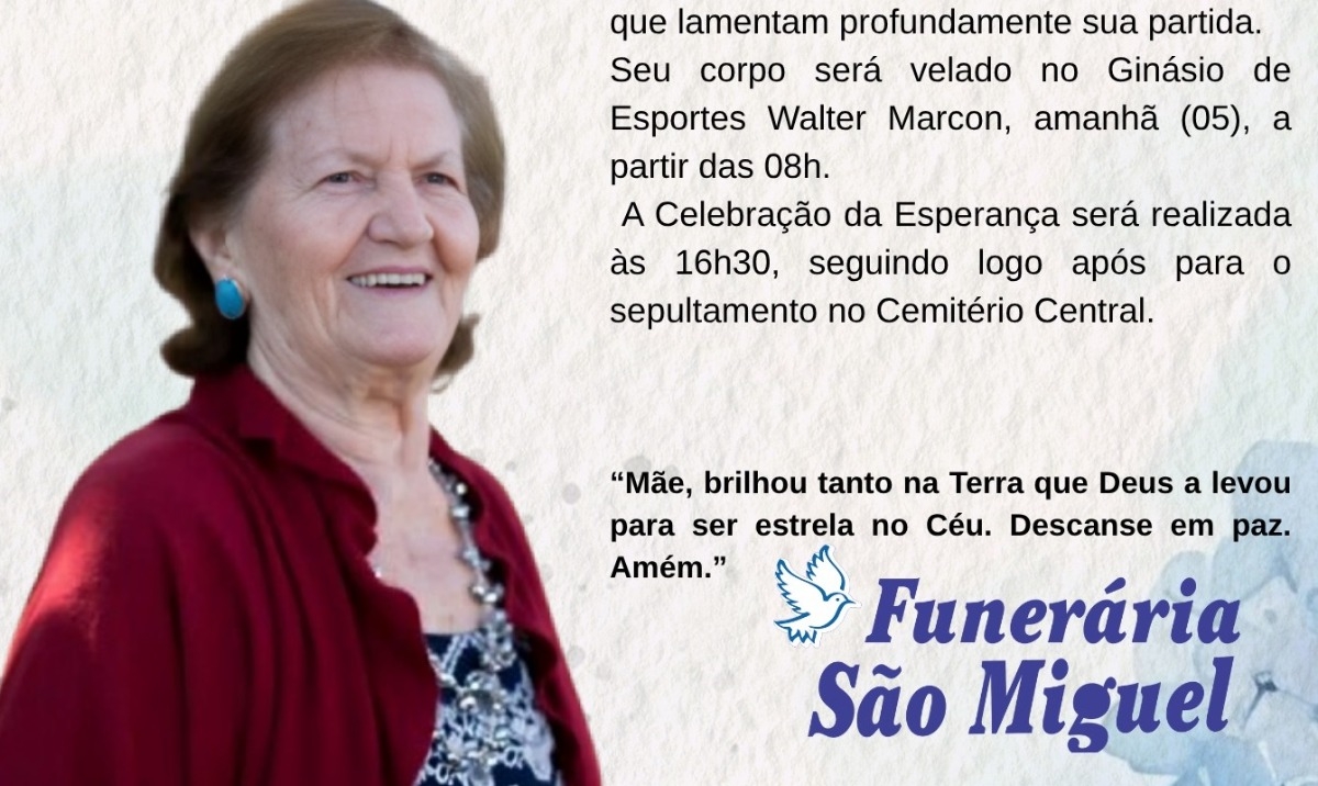Com profundo pesar, o Plano Safisul, a Funerária São Miguel e a família Dal Moro comunicam o falecimento de Wilmera Lorenzon Dal Moro, ocorrido ontem, 04 de novembro de 2025, aos 93 anos de idade.