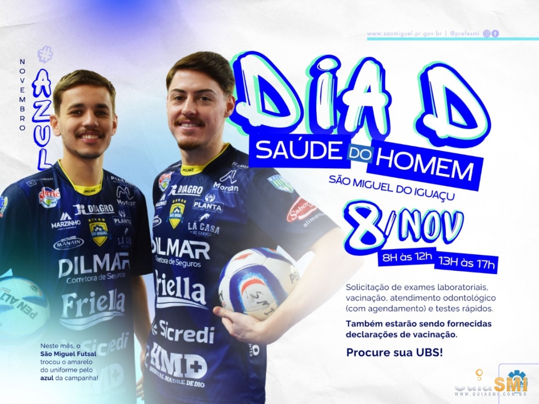 O Governo Municipal de São Miguel do Iguaçu, por meio da Secretaria de Saúde, realiza neste sábado, dia 08 de novembro, o “Dia D” da campanha Novembro Azul, com uma programação especial voltada à prevenção e ao cuidado com a saúde do homem.