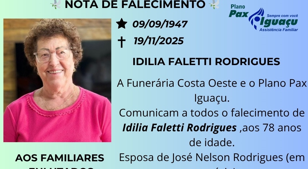 A Funerária Costa Oeste e o Plano Pax Iguaçu informam, com profundo pesar, o falecimento de Idilia Faletti Rodrigues, ocorrido na quarta-feira, 19 de novembro de 2025, aos 78 anos de idade.