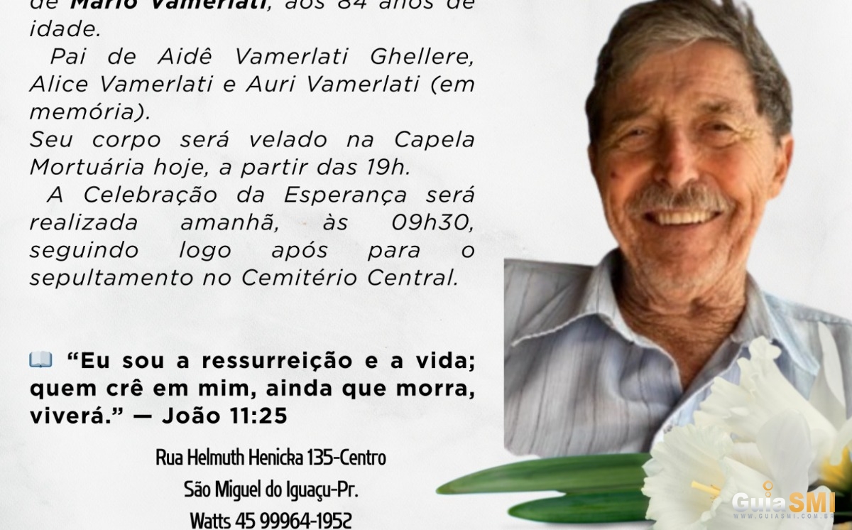 Pai de Aidê Vamerlati Ghellere, Alice Vamerlati e de Auri Vamerlati (em memória), Mário deixa um legado de carinho, simplicidade e fortes vínculos familiares, marcando sua passagem pela comunidade de São Miguel do Iguaçu.