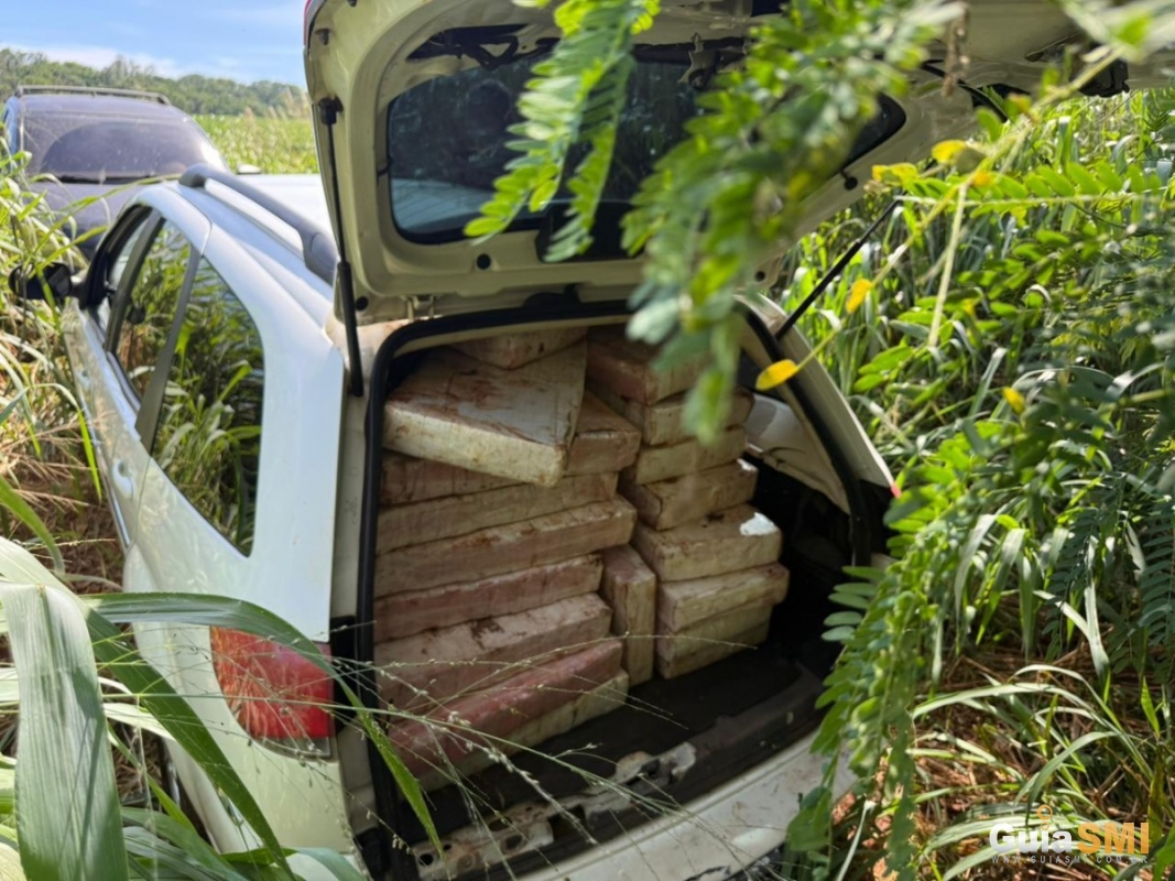 Ao seguir por uma trilha que levava à beira do lago, os policiais localizaram um Fiat Palio Weekend abandonado e carregado com dezenas de fardos de maconha prensada. O condutor fugiu antes da chegada das equipes, deixando todo o carregamento para trás.