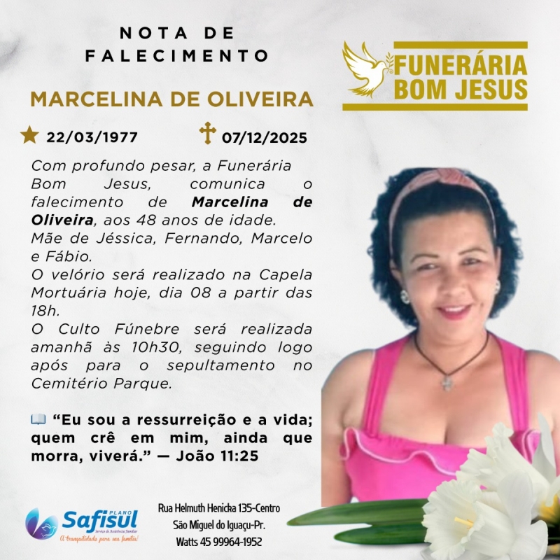 Com profundo pesar, a Funerária Bom Jesus comunica o falecimento de Marcelina de Oliveira, ocorrido no domingo, 07 de dezembro de 2025, aos 48 anos de idade. Sua partida deixa um grande vazio entre familiares, amigos e todos que tiveram o privilégio de compartilhar momentos ao seu lado.