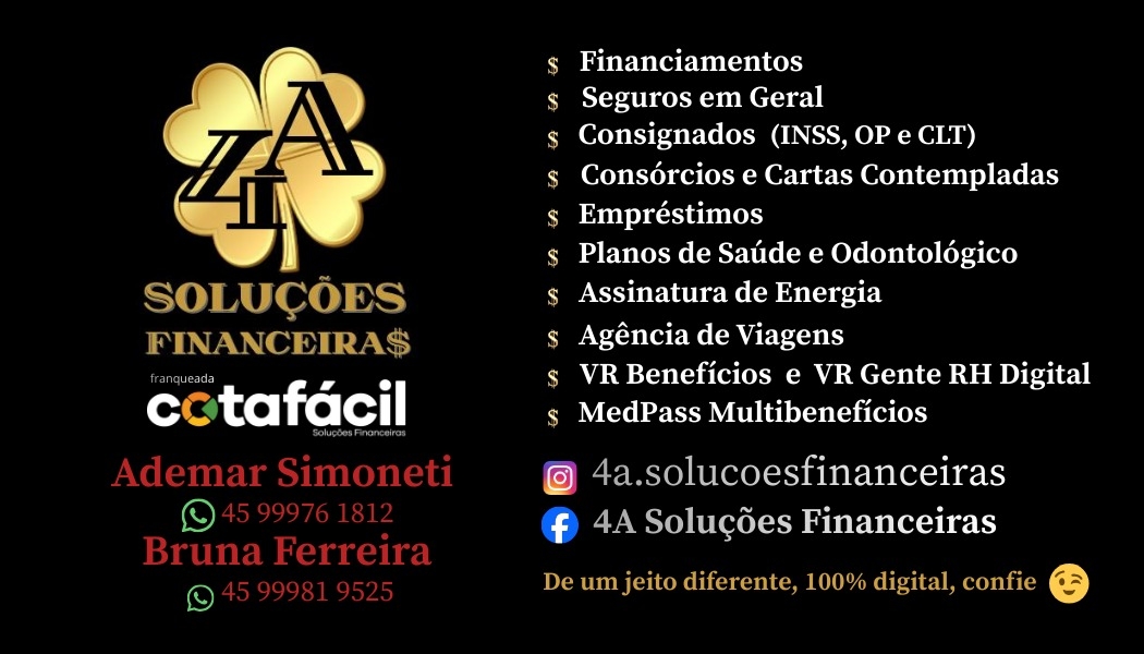 Com a proposta de facilitar o acesso a serviços essenciais, a 4A Soluções Financeiras oferece agora um atendimento 100% digital, ágil e seguro, ideal para quem busca praticidade e confiança na hora de contratar serviços financeiros. Entre as opções, estão desde soluções de crédito até produtos de proteção e gestão, tudo com a credibilidade das instituições parceiras.