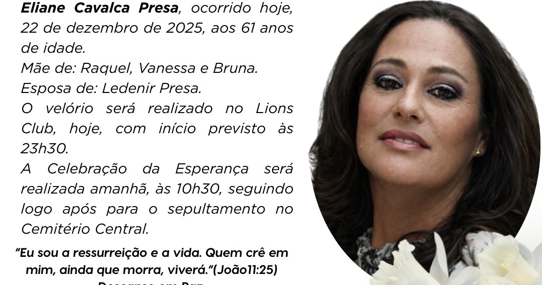 Com profundo pesar, a Funerária São Miguel comunica o falecimento de Eliane Cavalca Presa, ocorrido nesta segunda-feira, 22 de dezembro de 2025, aos 61 anos de idade.