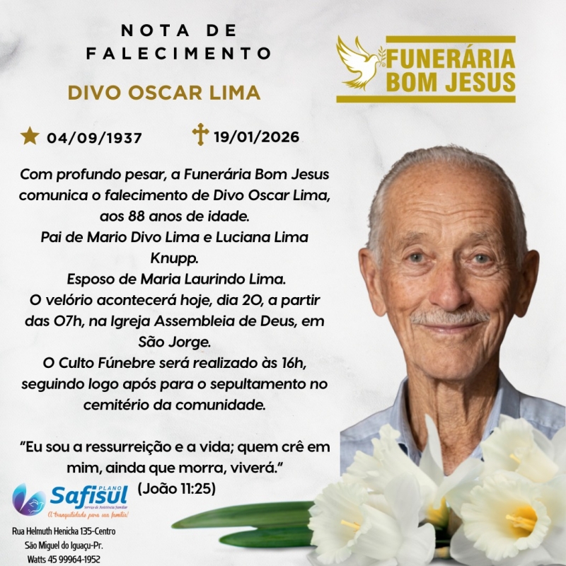 Com profundo pesar, a Funerária Bom Jesus comunica o falecimento de Divo Oscar Lima, ocorrido ontem, 19 de janeiro de 2026, aos 88 anos de idade.