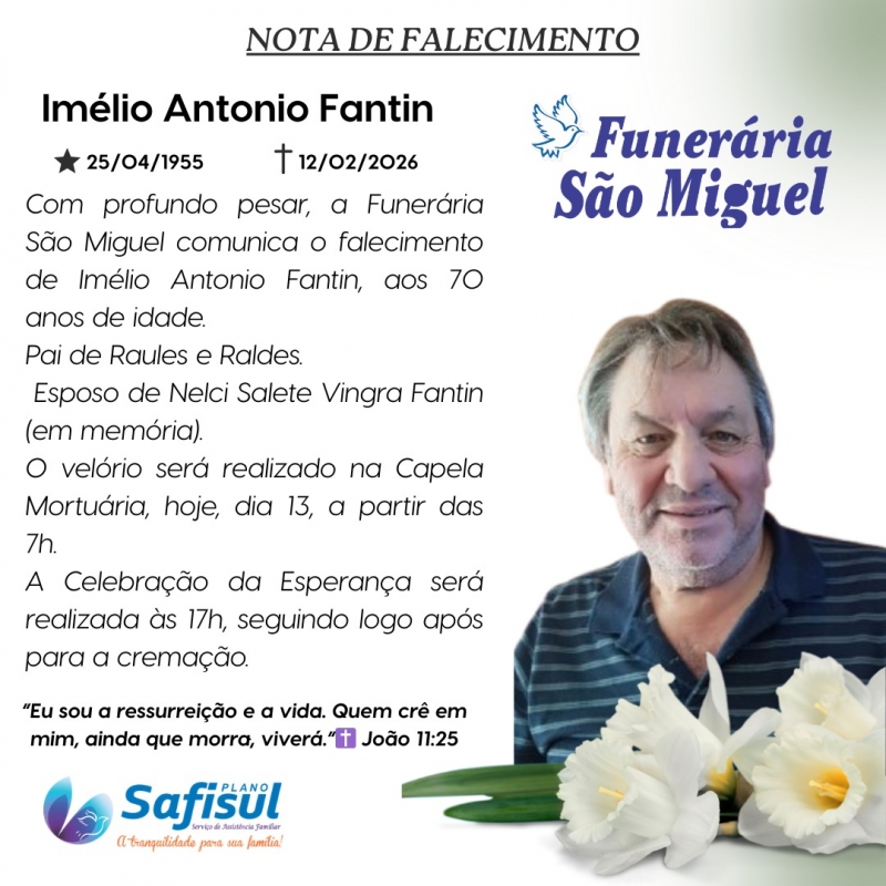 Com profundo pesar, a Funerária São Miguel comunica o falecimento de Imélio Antonio Fantin, ocorrido no dia 12 de fevereiro de 2026, aos 70 anos de idade. Nascido em 25 de abril de 1955, Imélio deixa familiares, amigos e uma trajetória marcada por convivência, trabalho e dedicação à família.