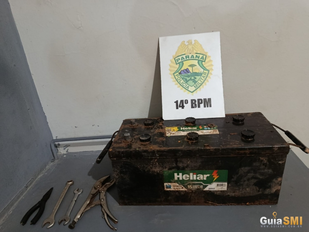 De acordo com as informações repassadas, dois indivíduos estariam furtando a bateria de um caminhão pertencente à frota do poder público municipal. Ao chegar ao local, os policiais localizaram um dos suspeitos já na parte externa da pedreira, de posse de ferramentas utilizadas na ação criminosa, além da bateria subtraída.