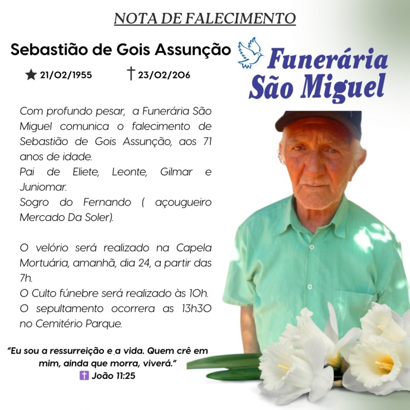 Com profundo pesar, a Funerária São Miguel comunicou o falecimento de Sebastião de Gois Assunção, ocorrido ontem, 23 de fevereiro de 2026, aos 71 anos de idade.