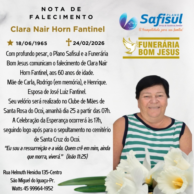 om profundo pesar, o Plano Safisul e a Funerária Bom Jesus comunicaram o falecimento de Clara Nair Horn Fantinel, ocorrido nesta segunda-feira, 24 de fevereiro de 2026, aos 60 anos de idade.