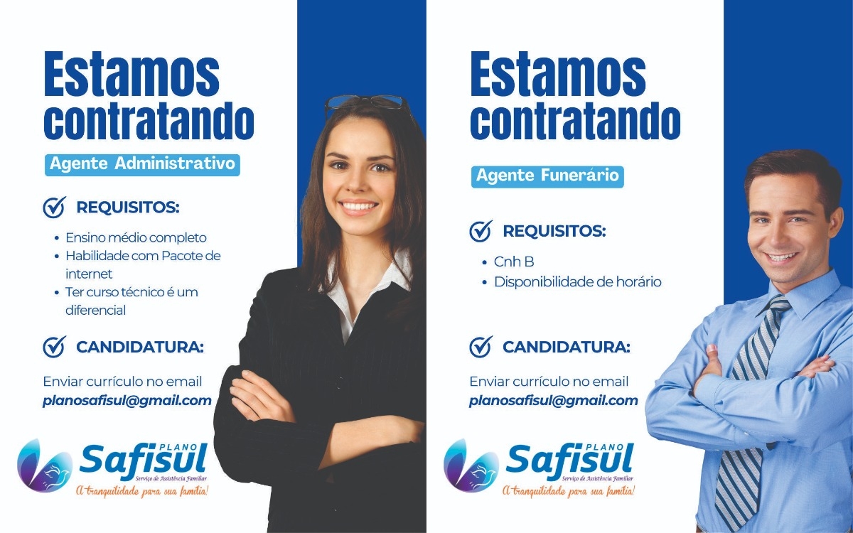 O Plano Safisul anunciou a abertura de vagas de emprego para os cargos de agente administrativo e agente funerário, ampliando sua equipe de colaboradores e oferecendo novas oportunidades no mercado de trabalho.