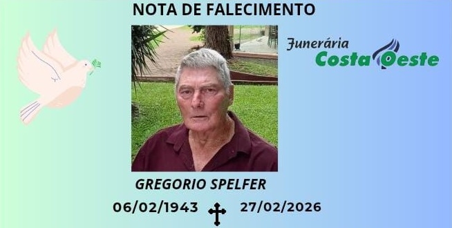 A Funerária Costa Oeste comunica o falecimento de Gregorio Spelfer, ocorrido nesta sexta-feira, 27 de fevereiro de 2026, aos 83 anos de idade.
