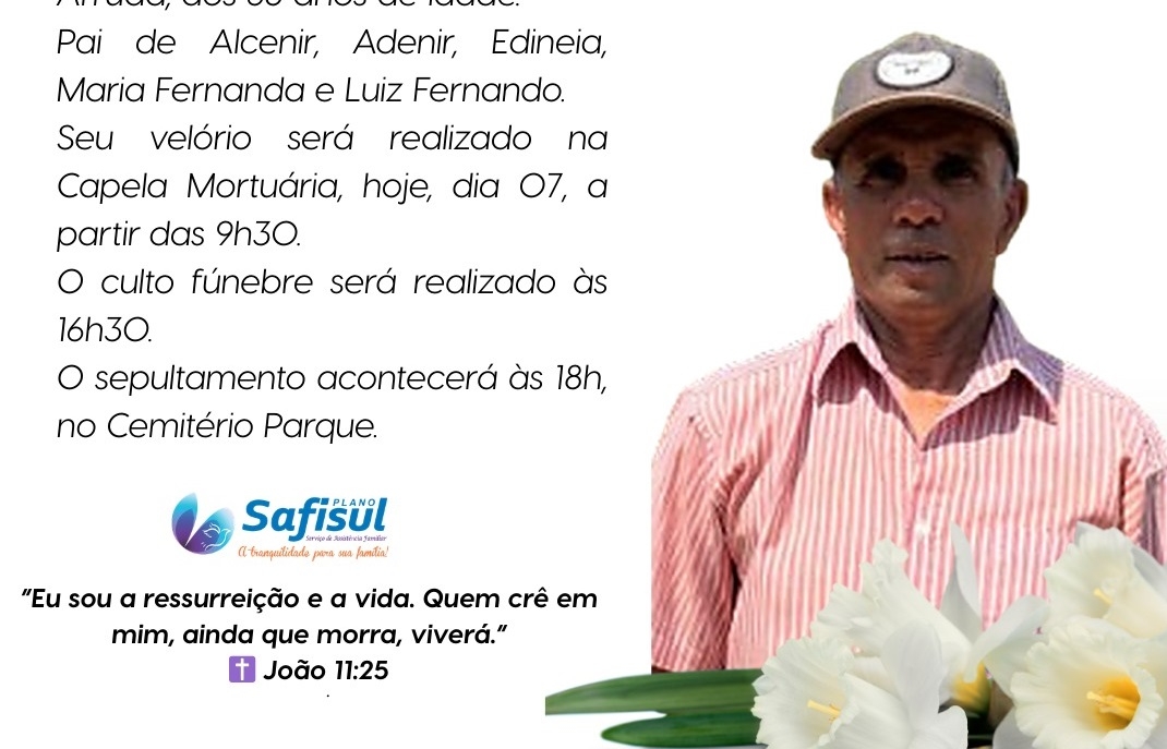 A Funerária São Miguel comunica com profundo pesar o falecimento de João Donizete Arruda, ocorrido neste sábado, 7 de março de 2026, aos 68 anos de idade.