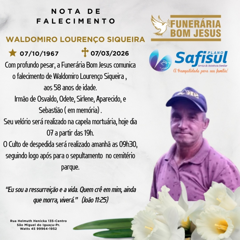 Com profundo pesar, a Funerária Bom Jesus comunica o falecimento de Waldomiro Lourenço Siqueira, ocorrido neste sábado, 7 de março de 2026, aos 58 anos de idade.