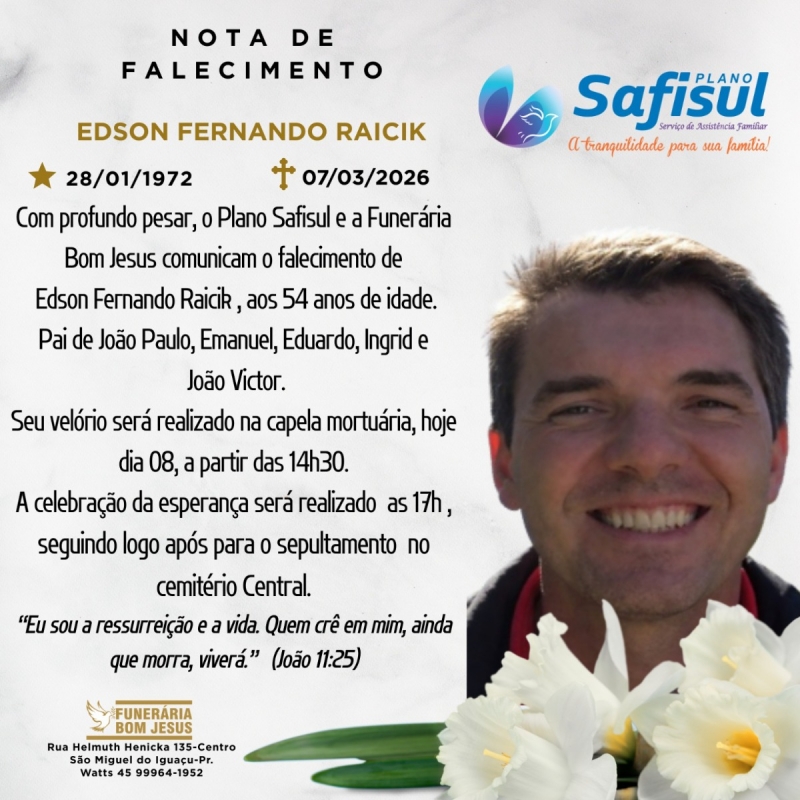 Com profundo pesar, o Plano Safisul e a Funerária Bom Jesus comunicam o falecimento de Edson Fernando Raicik, ocorrido no sábado, dia 7 de março de 2026, aos 54 anos de idade.