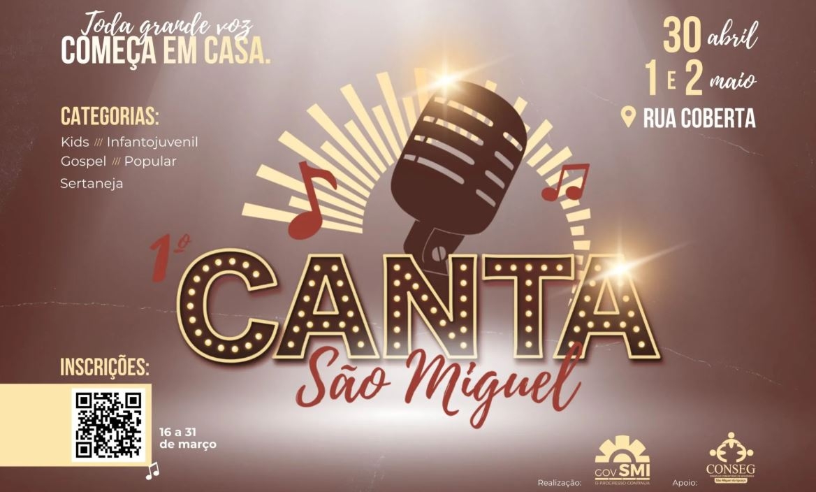 O Governo Municipal de São Miguel do Iguaçu vai promover a 1ª edição do Canta São Miguel – Festival Municipal de Música, iniciativa que passa a integrar o calendário cultural do município com o objetivo de valorizar e incentivar talentos locais. A programação será realizada nos dias 30 de abril e 01 e 02 de maio, na Rua Coberta Addy Cavalca, com entrada gratuita.