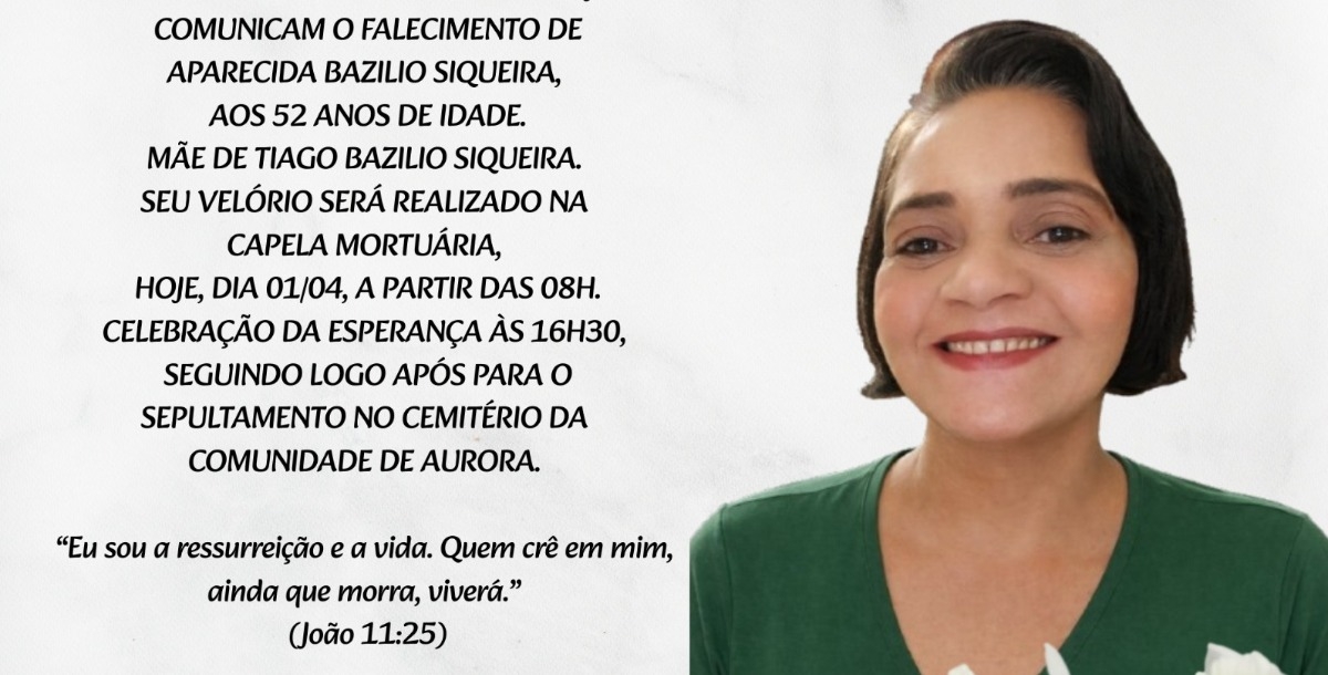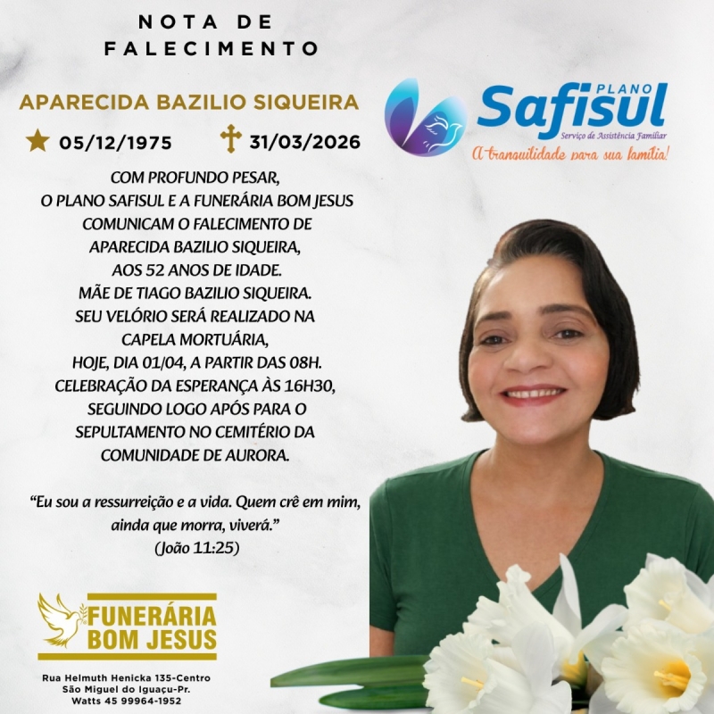 Com profundo pesar, o Plano Safisul e a Funerária Bom Jesus comunicam o falecimento de Aparecida Bazilio Siqueira, ocorrido ontem, 31 de março de 2026, aos 52 anos de idade.