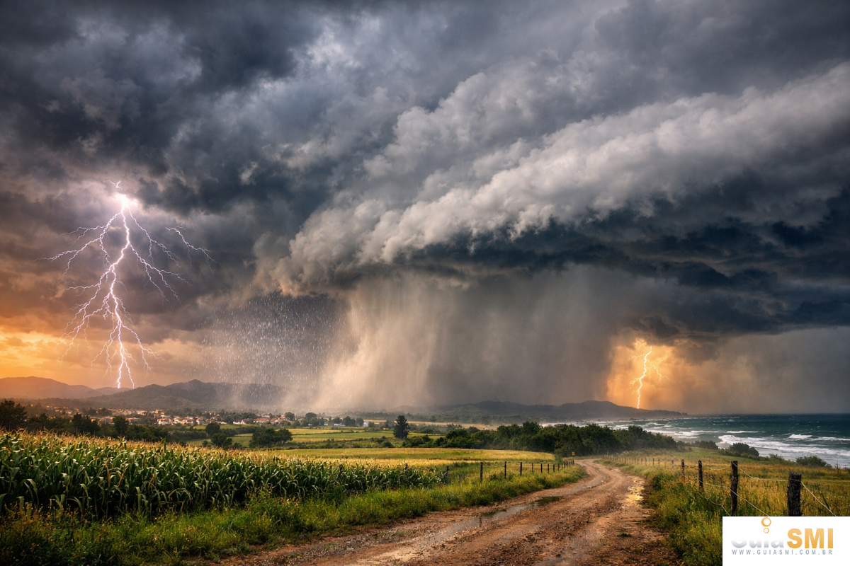 No interior paranaense, o cenário exige atenção. O aquecimento mais expressivo ao longo do dia favorece a formação de tempestades isoladas, que podem vir acompanhadas de raios, ventos fortes e chuva intensa em curto período.