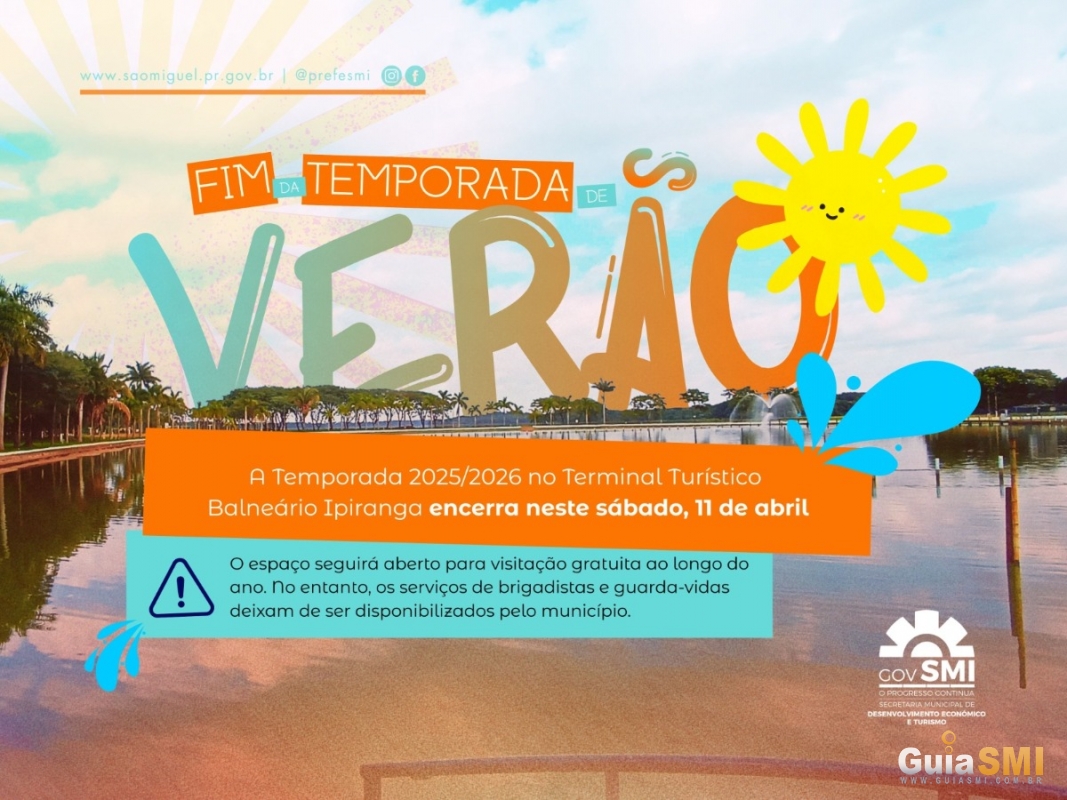 O Governo Municipal de São Miguel do Iguaçu, por meio da Secretaria de Desenvolvimento Econômico e Turismo, informou que a Temporada de Verão 2025/2026 no Terminal Turístico Balneário Ipiranga será oficialmente encerrada neste sábado, dia 11 de abril.