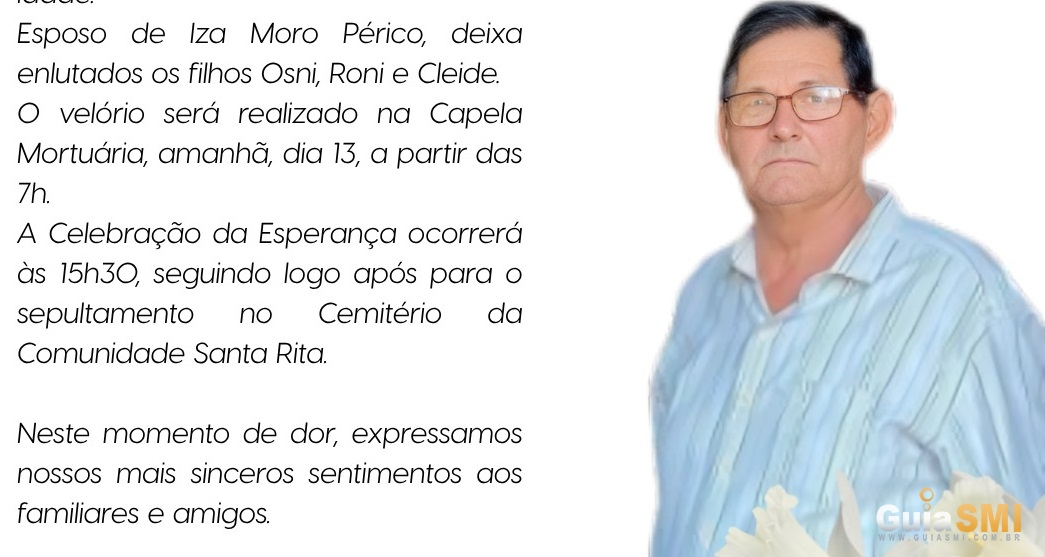 Com profundo pesar, a Funerária São Miguel comunica o falecimento de Alexandre Périco, ocorrido ontem, domingo (12/04/2026), aos 76 anos de idade.