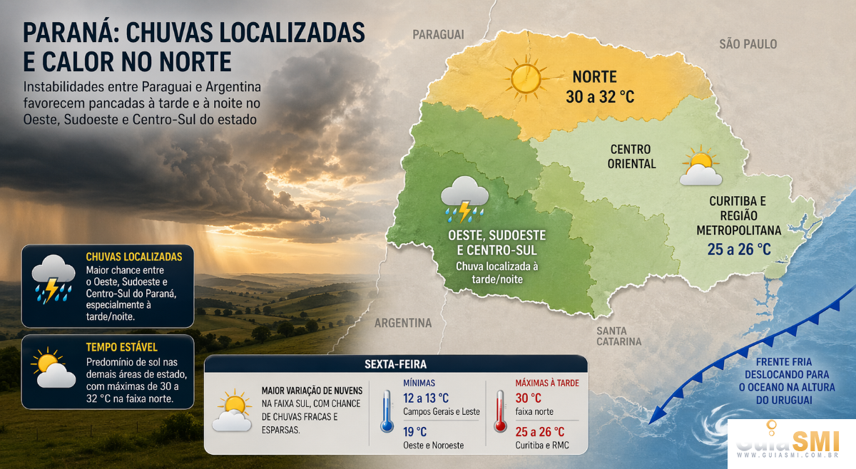 Para a sexta-feira, a previsão aponta uma maior variação de nuvens na faixa sul do estado, com possibilidade de chuvas fracas e esparsas. O dia começa com temperaturas mais amenas, variando entre 12°C e 13°C nas regiões dos Campos Gerais e no Leste do Paraná. No Oeste e Noroeste, as mínimas ficam em torno dos 19°C.