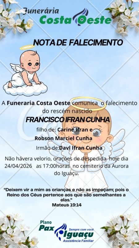 Funerária Costa Oeste comunica falecimento do recém-nascido Francisco Ifran Cunha
