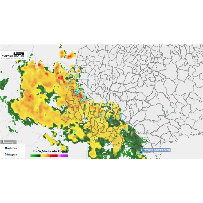 Com a nova frente fria deslocando seu eixo mais instável pelo sul do país, chove no momento a partir do oeste e sudoeste do Paraná. Na imagem, com projeção de áreas de chuvas pelos radares meteorológicos do Simepar, nota-se o panorama de intensidade e distribuição destas chuvas a partir do oeste e sudoeste paranaense. - Fernando Mendonça Mendes