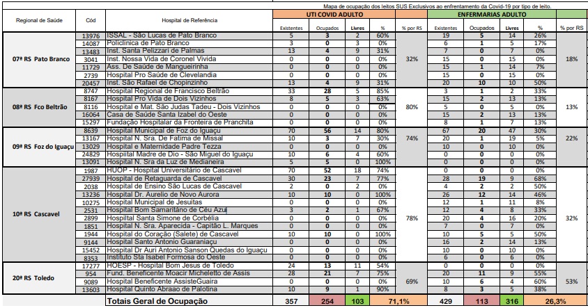 Segundo as informações, dos 357 leitos disponíveis, 254 estão ocupados, sendo 71,1% dos leitos.