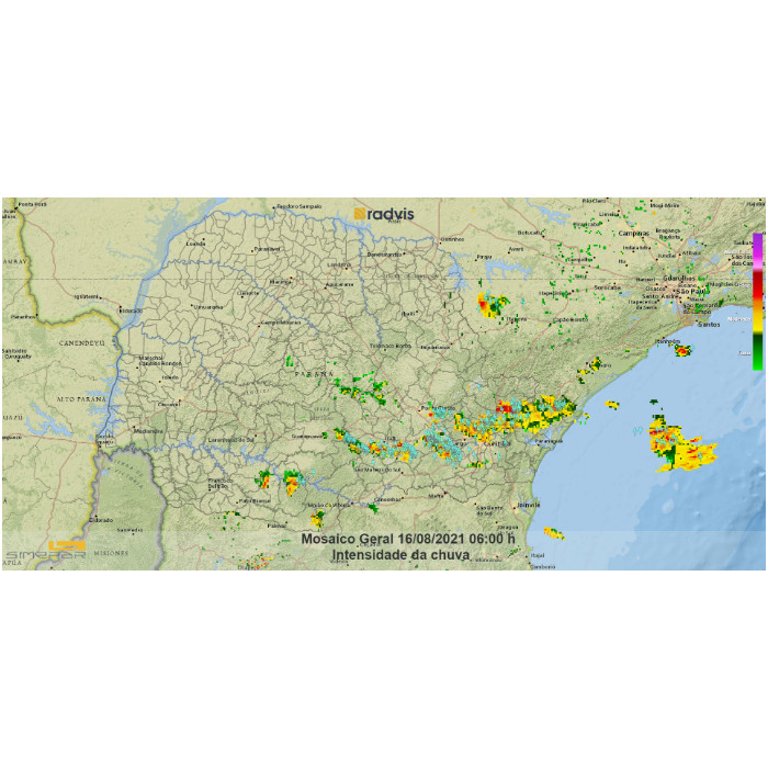 O dia esta começa com pancadas de chuvas acompanhadas de descargas elétricas entre as regiões sul, centro-sul e o leste do estado. Nas demais regiões, apesar da presença da nebulosidade, não há registros de chuvas neste momento. As temperaturas estão variando entre 21 ºC no noroeste e 12 ºC no sul do estado, em Curitiba os termômetros registram 13 ºC. A imagem dos radares do Simepar, mostra as áreas de chuvas que atuam neste início de manhã sobre o Paraná. - Paulo Ricardo Bardou Barbieri