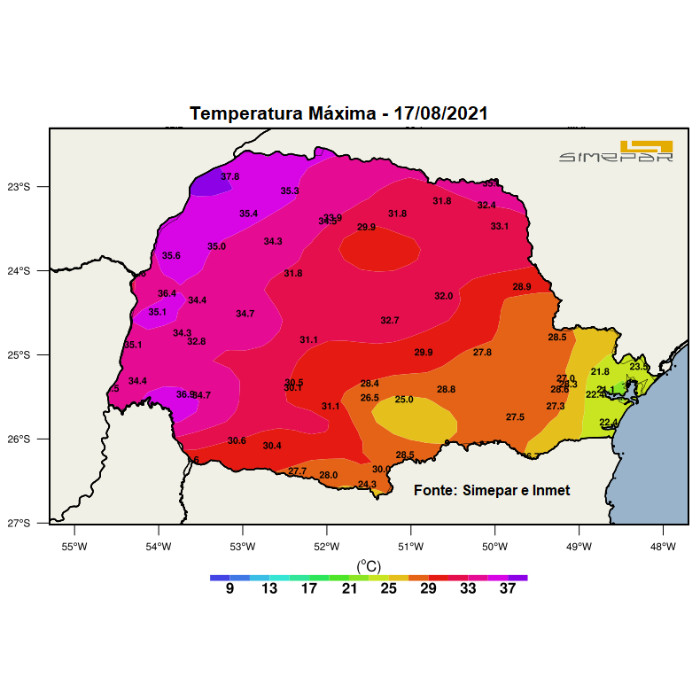 O dia está começando com tempo estável nas diversas regiões do estado. Há registros de nevoeiros em algumas localidades entre a RMC e a Serra do Mar. Nas regiões noroeste e norte, o dia esta começando com temperaturas em torno dos 25 ºC. No dia de ontem, a massa de ar seco e quente que predomina sobre o estado, deixou a tarde abafada em grande parte das regiões paranaenses, apenas no litoral, onde predominou a nebulosidade, as temperaturas ficaram mais amenas. O destaque ficou por conta de Loanda, onde os termômetros registraram 37,8 ºC. O mapa mostra as temperaturas máximas registradas no dia de ontem (17/08). - Paulo Ricardo Bardou Barbieri