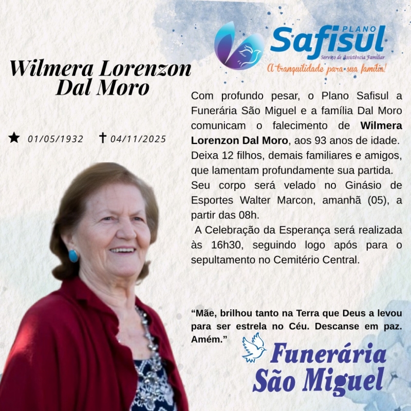 Com profundo pesar, o Plano Safisul, a Funerária São Miguel e a família Dal Moro comunicam o falecimento de Wilmera Lorenzon Dal Moro, ocorrido ontem, 04 de novembro de 2025, aos 93 anos de idade.