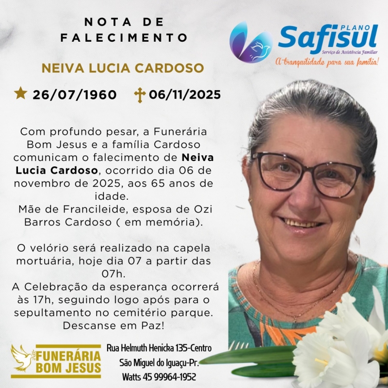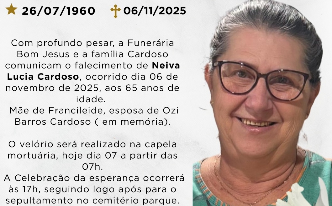 Com profundo pesar, a Funerária Bom Jesus e a família Cardoso comunicam o falecimento de Neiva Lucia Cardoso, ocorrido na quinta-feira, 06 de novembro de 2025, aos 65 anos de idade.