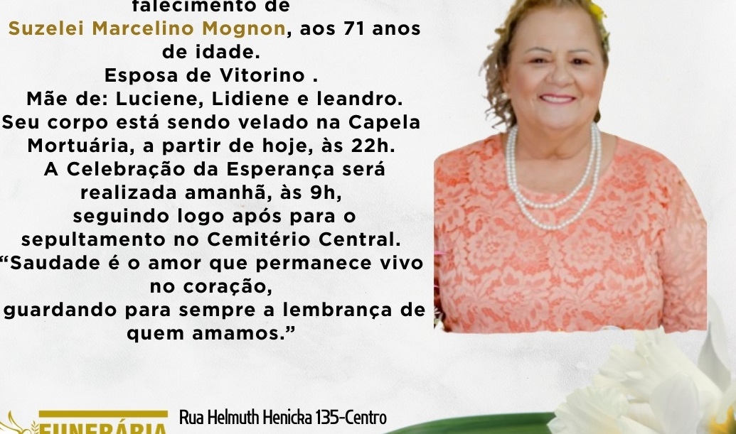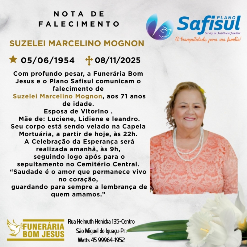 Com profundo pesar, a Funerária Bom Jesus e o Plano Safisul comunicam o falecimento de Suzelei Marcelino Mognon, ocorrido nesta sexta-feira, 08 de novembro de 2025, aos 71 anos de idade.