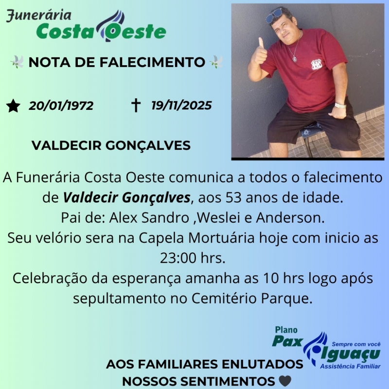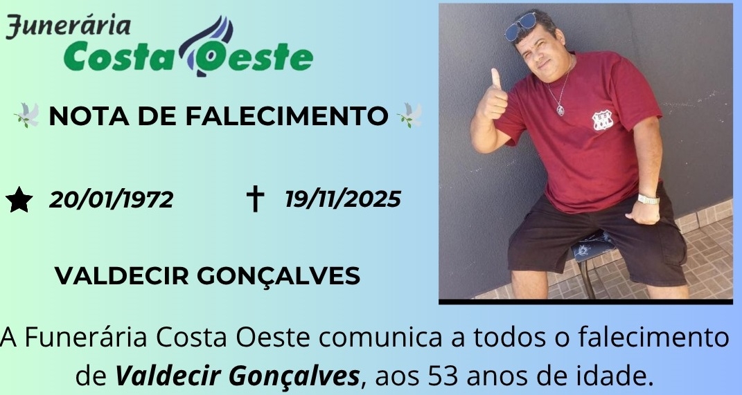 A Funerária Costa Oeste comunica, com pesar, o falecimento de Valdecir Gonçalves, ocorrido na quarta-feira, dia 19 de novembro de 2025, aos 53 anos. Valdecir deixa os filhos Alex Sandro, Weslei e Anderson, que, junto aos demais familiares e amigos, vivem este momento de dor e saudade.