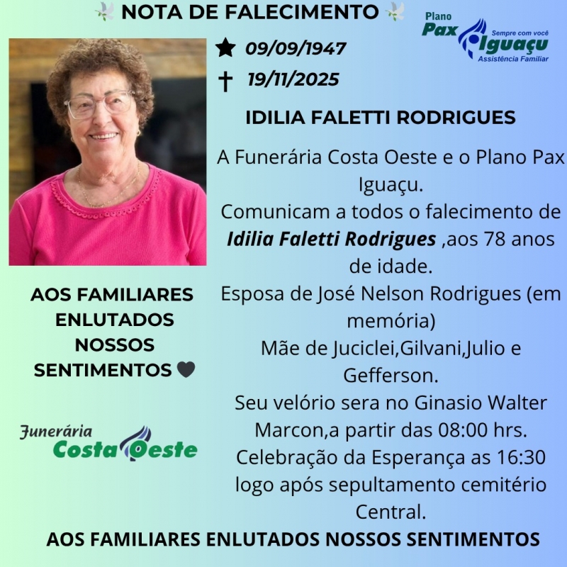 A Funerária Costa Oeste e o Plano Pax Iguaçu informam, com profundo pesar, o falecimento de Idilia Faletti Rodrigues, ocorrido na quarta-feira, 19 de novembro de 2025, aos 78 anos de idade.