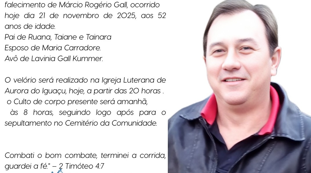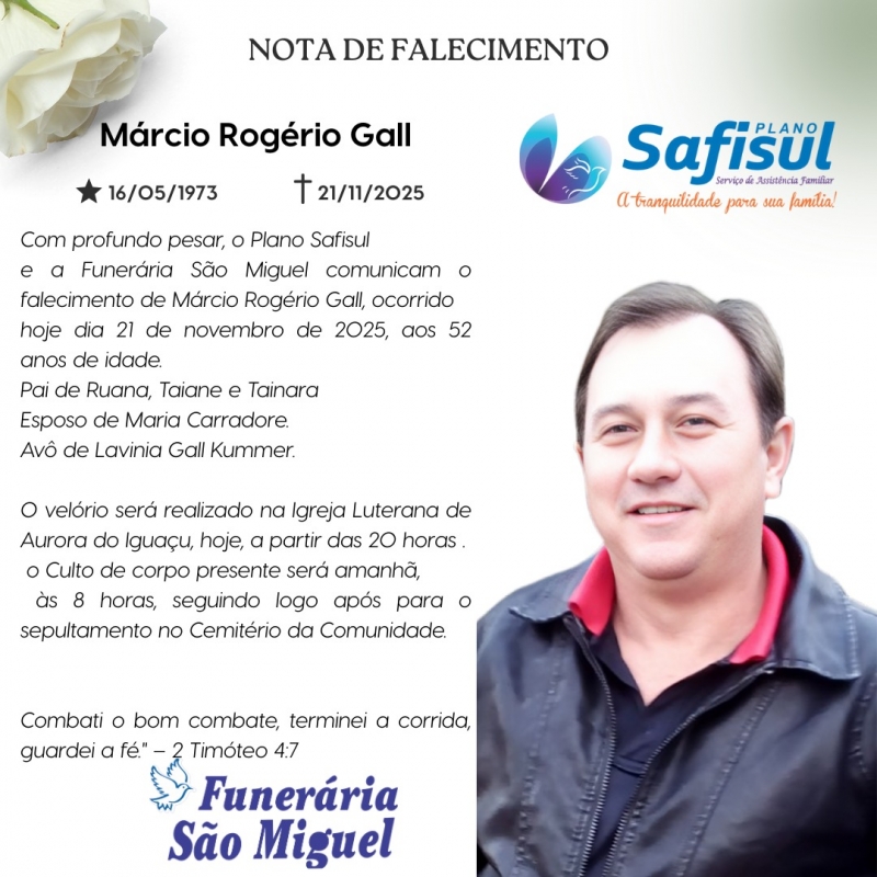 Com profundo pesar, o Plano Safisul e a Funerária São Miguel comunicam o falecimento de Márcio Rogério Gall, ocorrido nesta sexta-feira, 21 de novembro de 2025, aos 52 anos de idade.