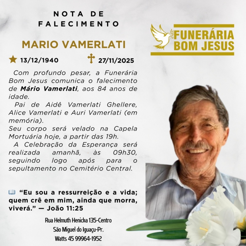 A Funerária Bom Jesus comunica, com profundo pesar, o falecimento de Mário Vamerlati, ocorrido nesta quinta-feira, 27 de novembro de 2025, aos 84 anos.