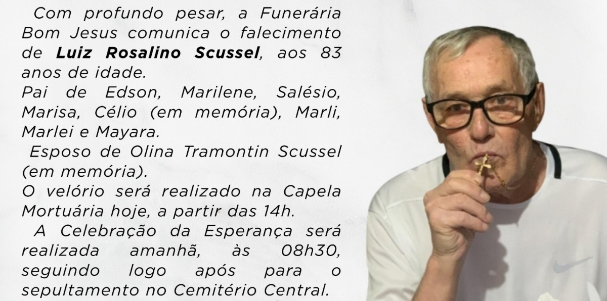 Neste momento de dor e saudade, expressamos nossos mais sinceros sentimentos aos familiares e amigos enlutados, desejando que encontrem conforto e paz. Que a memória de Luiz Rosalino Scussel permaneça viva no coração de todos que tiveram o privilégio de conviver com ele.