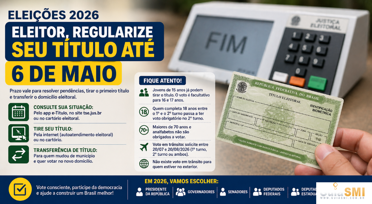 O dia 6 de maio também é o prazo final para solicitar a transferência do título, destinada a quem mudou de município e deseja votar no novo domicílio eleitoral. As regras completas estão disponíveis no site do TSE.